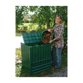 Large capacity 158 gallon composter turns kitchen waste into rich nutritious compost.Constructed from 100% recycled UV-resistant polypropylene. Two large top flaps for easy filing. Secure wind-proof latches keep top closed. Folding bottom exit door for compost removal. Panels snap together for easy assembly - no tools required! Made in Germany. 31.5"L x 31.5"W x 37"H 27lbs 158 Gal.
