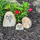 This adorable Family of Boulder Angry Birds would be a great addition around your garden or in your home. They also make perfect gifts! They are made from Natural Granite Boulder with inlaid quartz eyes. Since each boulder pet is hand carved it is unique in shape and color. This 3 piece set includes a 3-4" 1-2lb 6" 3-4lb & 8" 15-17lb Angry Bird. Height and weight are approximate.