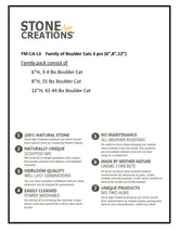This adorable Family of Boulder Cats would be a great addition around your garden or in your home. They also make perfect gifts! They are made from Natural Granite Boulder with hand carved accents. Since each boulder pet is hand carved it is unique in shape and color. This 3 piece set includes a 6" 3-4lb, 8" 12-14lb, & 12" 42-44lb Boulder Cat. Height and weight are approximate.