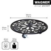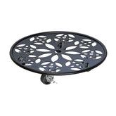 Wagner Round Plant Caddy in timeless cast iron insteel with a flower design. Twin wheel smooth-rolling casters glide easily over carpets and floors without marring or tipping. Casters are equipped with brakes for safe positioning. Water resistant finish so it can be used indoors or out. The Wagner company located in southern Germany near the Black Forest has earned a reputation for exceptional quality. With over 40 years experience in design and manufacturing their products are rigorously tested for quality safety and durability. 220 lbs. capacity 11.8"D x 2.25"H 1.8 lbs.