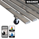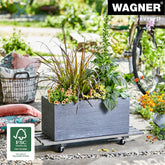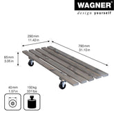 Wagner Vintage Rectangular Wooden Plant Caddy is made from sustainably-harvested pine with water resistant finish to protect color. It is also water-repellent so it can be used indoors or out! It's the ideal size for holding two or 3 plants. Soft smooth-rolling casters glide over carpets and floors without marring or tipping great for laminate wood or tile floors. The Wagner company located in southern Germany near the Black Forest has earned a reputation for exceptional quality. With over 40 years experience in design and manufacturing their products are rigorously tested for safety and durability. 330 lbs. capacity 31"L x 11.5"W x 3.4"H 3.6 lbs