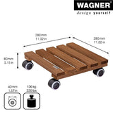 Wagner Square Medium Wash Wooden Pallet Plant Caddy is made from sustainably-harvested pine with an oil based water resistant finish. Twin wheel smooth-rolling casters glide easily over carpets and floors without marring or tipping great for laminate wood or tile floors. The Wagner company located in southern Germany near the Black Forest has earned a reputation for exceptional quality. With over 40 years experience in design and manufacturing their products are rigorously tested for safety and durability. 220 lbs. capacity 11.4"D x 2.75"H 1.65 lbs