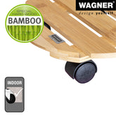 Beautiful Bamboo Round Plant Caddy has twin wheel swivel casters that easily glide across varying surfaces. Sleek design enviornmentally-friendly material. Indoor use. The Wagner company located in southern Germany near the Black Forest has earned a reputation for exceptional quality. With over 40 years experience in design and manufacturing their products are rigorously tested for safety and durability. 220 lbs. capacity 11.4"D x 2.75"H 1.4 lbs.