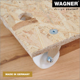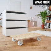This sturdy Wagner moving dolly 64-1141 is made from 100% formaldehyde-free OBS plate. With it you can move boxes devices and heavy loads of up to 550 lbs. effortlessly and comfortably on an area of 23x12. Solid rubber wheels ensure safe transport even on uneven floors. Made in Germany and Wagner tested quality seal guarantee the highest quality. Perfect for indoor transport in the warehouse picking as well as for easy movement in the office in the workshop when shopping or when moving. For those who want to move tools shopping boxes or other heavy loads up to 550 lbs. comfortably and safely. With the caddy weighing only 6lbs. and thanks to the handle hole you can move and store the transport aid easily. Castors made of galvanized industrial steel high-quality plastic and roller bearings ensure optimum mobility and smooth transport on robust floors. Environmentally friendly recycled material.