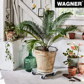 Wagner Square Aluminum Plant Caddy in a fresh contemporary design. Equipped with soft equipment casters providing protection on all surfaces won't scratch or mar floors. Two casters are fitted with a strong brake for easy and safe positioning. Surface design prevents pots from slipping. Use indoors or out. The Wagner company located in southern Germany near the Black Forest has earned a reputation for exceptional quality. With over 40 years experience in design and manufacturing their products are rigorously tested for safety and durability. 330 lbs. capacity 11.4"W x 11.4"D x 2.75"H 2.3 lbs